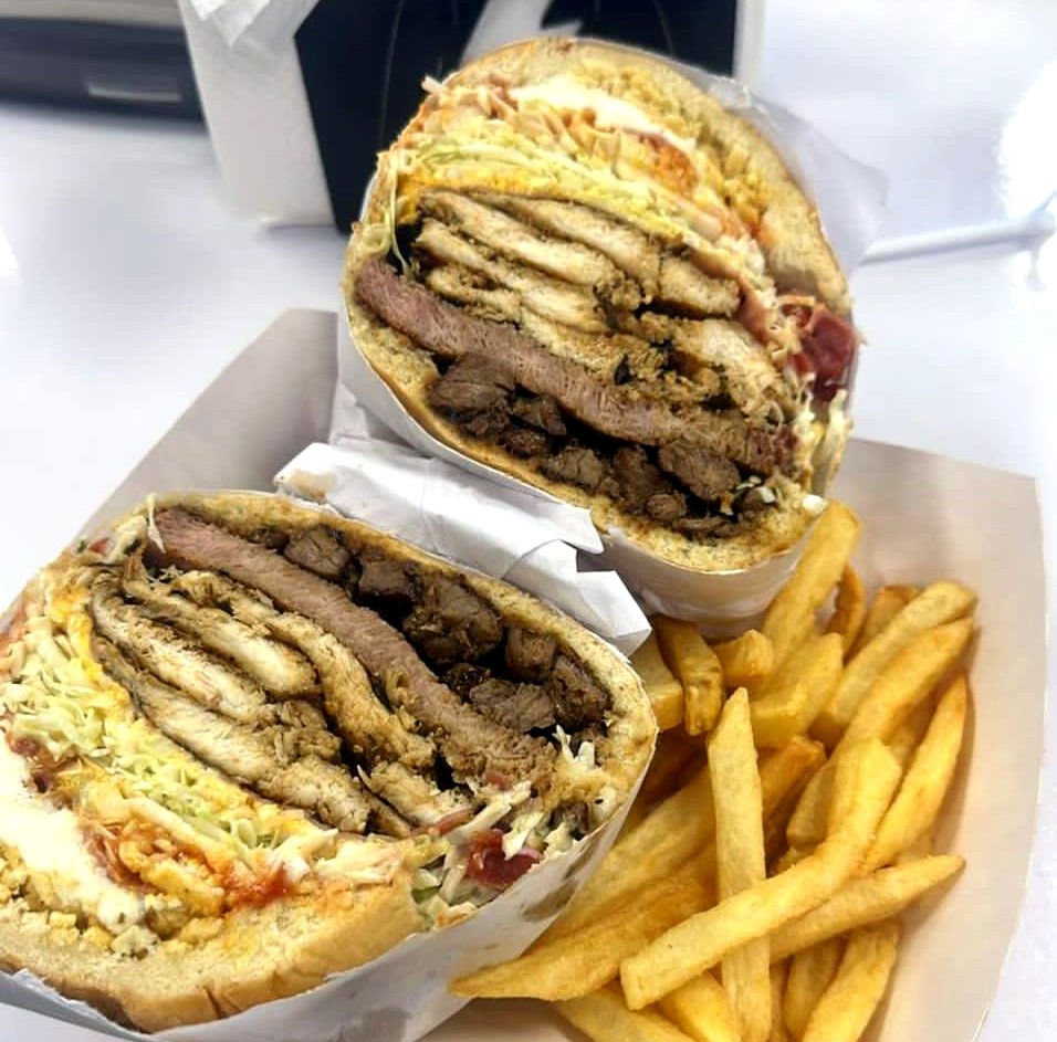 Chicken fillet, cabbage, smoked ham, cheddar and white cheese, bacon, house sauce, ketchup, mustard.